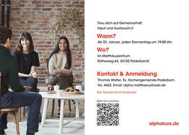 Am 22. Januar 2026 startet wieder "Alpha - der Kurs" in der Matthäus-Kirche. Das ist unser erneutes Angebot für Menschen auf der Suche. Alpha ist offen für alle und gibt Gelegenheit Fragen, Wünsche und Hoffnungen zu stellen, die uns bewegen.