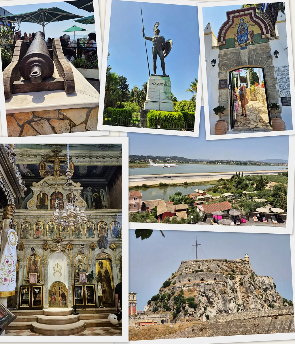 o.li. und Mitte re.: Kanoni, o. Mitte: Achilleon, o.re.: Paleokastritsa, u.li.: Paleokastritsa, u.re.: alte Festung Korfu Stadt