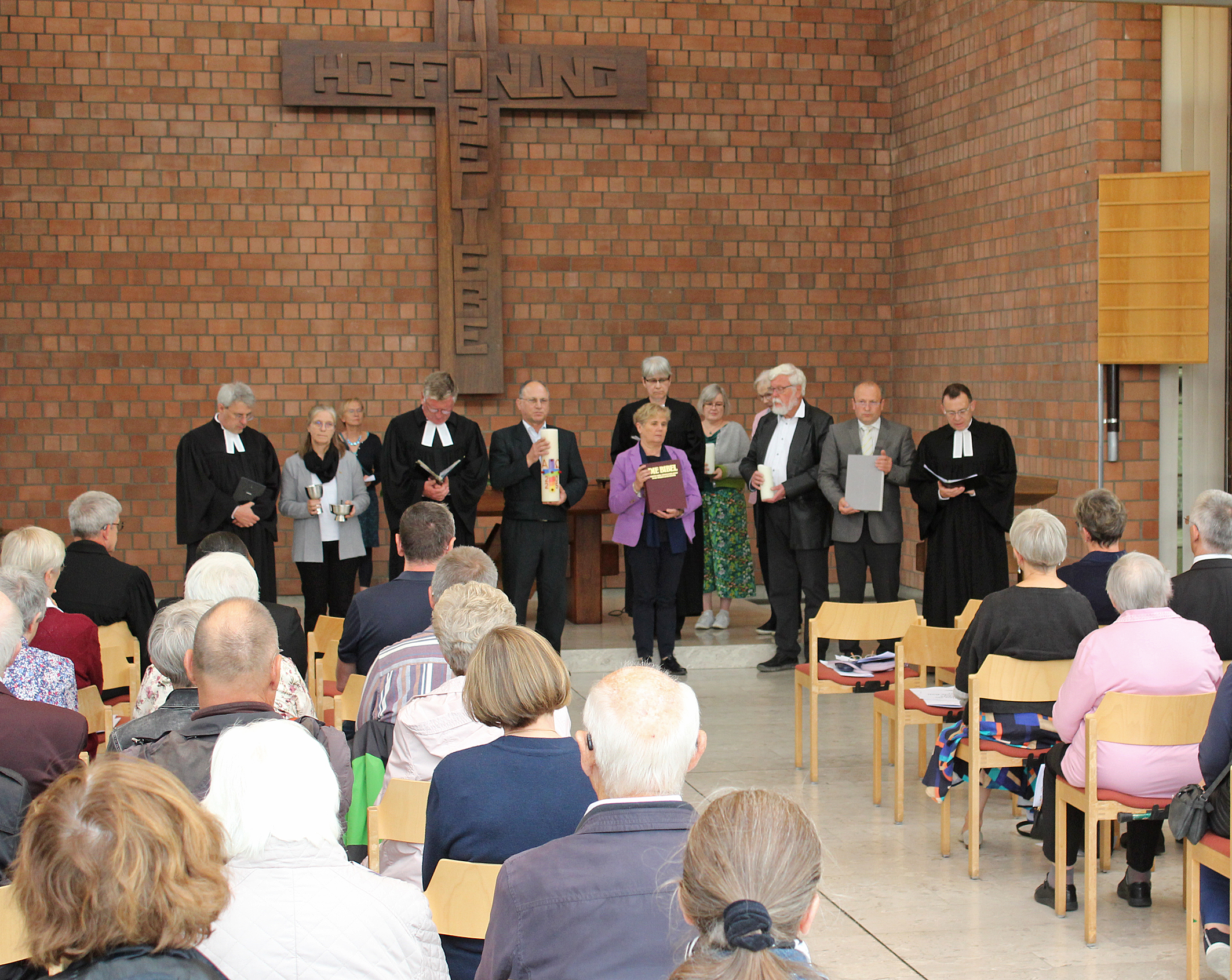 Einfach seien die vergangenen Wochen für Pfarrer Thomas Fischer nicht gewesen, sagte Superintendent Volker Neuhoff. Abschiede und Rückblicke hätten die Gefühlslage bestimmt, Termine fanden zu letzten Mal statt und beim Martin-Luther-Zentrum würden die Türen abgeschlossen. In diesen besonderen Abschied mische sich Neues, sagte der Superintendent. Er dankte Pfarrer Fischer für seinen Dienst in der Evangelischen Kirche und verabschiedete ihn in eine neue Lebensphase mit mehr Zeit für die Familie, den Hund und das Motorradfahren.